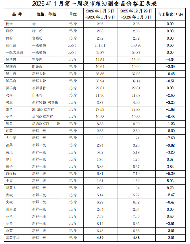 1月第一周我市糧油副食品價格