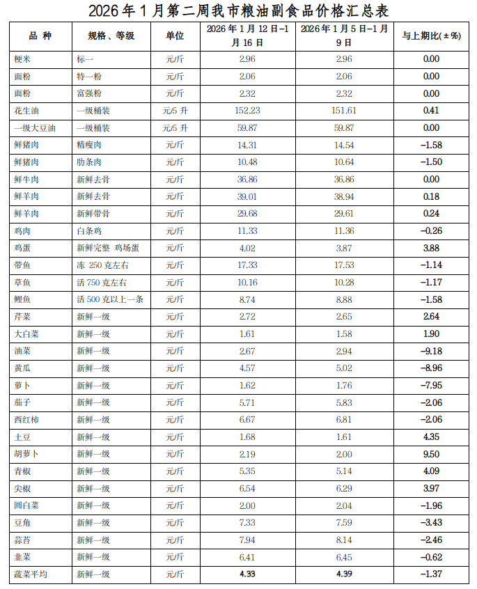 1月第二周我市糧油副食品價格