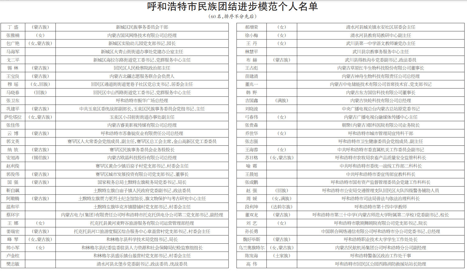 關于呼和浩特市民族團結進步模范集體和模范個人擬表彰對象的公示