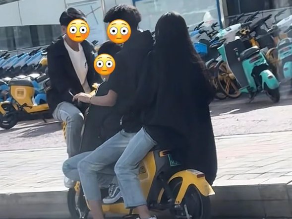 畫面中,一輛小小的共享單車竟“承載”了四名年輕人:一名男子蜷縮在極其脆弱的車前筐內(nèi),搖搖欲墜;另一名男子蹲在踏板處,身體難以平衡;一名騎行男子費(fèi)力操控著方向,而其身后后座上還搭載著一名女孩。該車輛在道路上穿行,不僅違反了道路交通安全法律法規(guī),更將自己和他人置于極大的危險(xiǎn)之中。