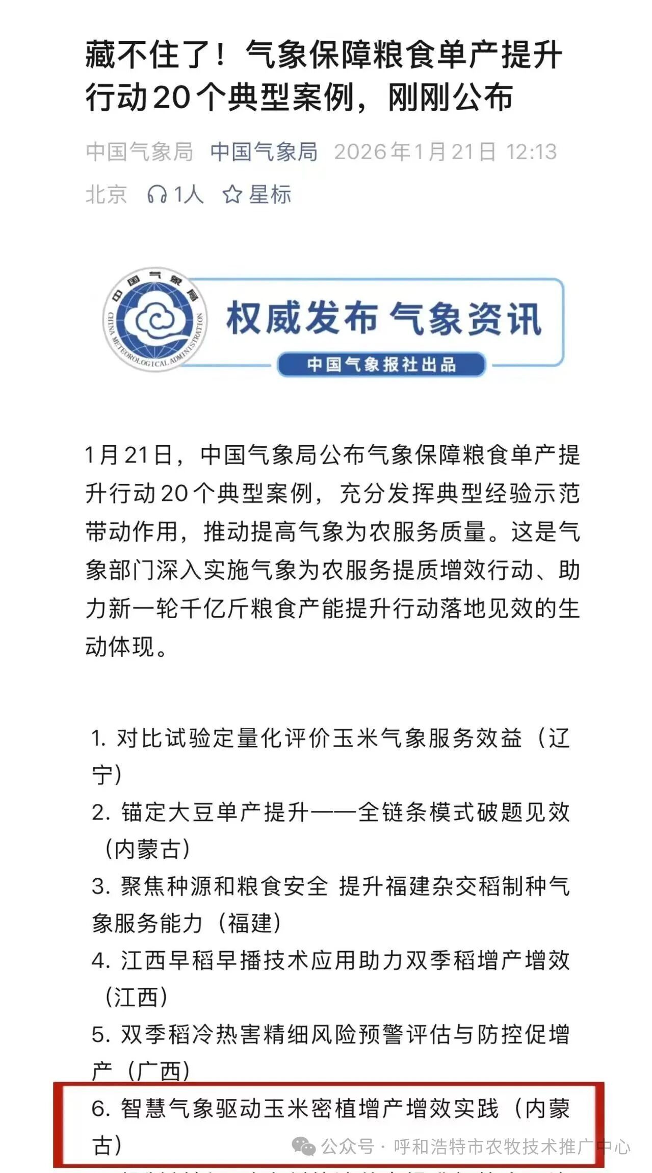 全國典型!呼和浩特市農(nóng)牧技術(shù)推廣中心“智慧氣象驅(qū)動玉米密植增產(chǎn)增效實踐”入選中國氣象局氣象保障糧食單產(chǎn)提升行動典型案例