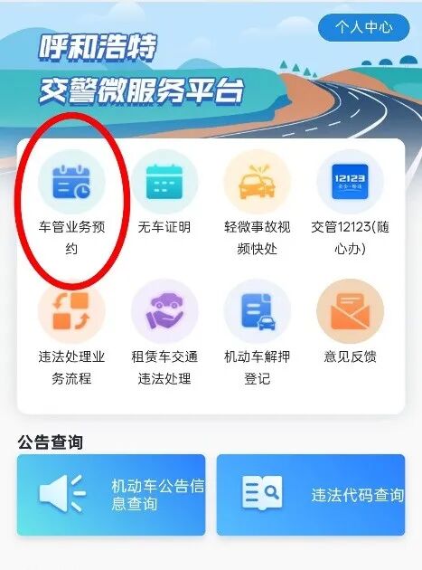 關(guān)注呼和浩特交警微信公眾號→找到菜單欄車管業(yè)務(wù)預(yù)約入口→完成實名認證注冊登錄,即可進入預(yù)約系統(tǒng)。