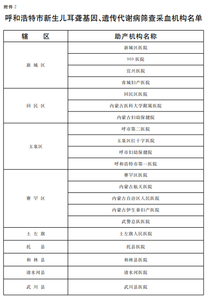 2.呼和浩特市新生兒耳聾基因、遺傳代謝病篩查采血機構名單