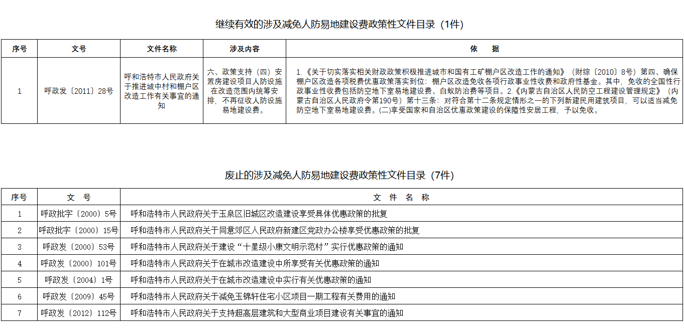 為深入落實自治區黨委、紀委監委關于人防系統腐敗問題專項治理調查整頓的部署精神,按照《內蒙古自治區規范性文件制定和備案監督辦法》(自治區人民政府令第191號)和內蒙古自治區人民防空辦公室印發《關于清理廢止制約人民防空事業健康發展政策性文件的通知》(內人防字〔2020〕152號)要求,市人民政府對2000年以來涉及減免人防易地建設費等制約人防事業健康發展的9件市本級政策性文件進行清理。經過認真清理、研究,決定確認繼續有效涉及減免人防易地建設費政策性文件1件,廢止涉及減免人防易地建設費政策性文件7件,需要說明的一個文件是《呼和浩特市人民政府2013年第26次市長辦公會議紀要》,該會議紀要第一、(六)(七)兩部分內容涉及到防空地下室易地建設費,依據是《呼和浩特市人民政府關于支持超高層建筑和大型商業項目建設有關事宜的通知》(呼政發〔2012〕112號)文件,112號文件第四條規定“本通知執行期限為2013年1月至2013年12月”,隨著制定依據112號文件的失效,《呼和浩特市人民政府2013年第26次市長辦公會議紀要》第一、(六)(七)兩部分內容隨之失效,但該會議紀要的其他內容繼續有效。