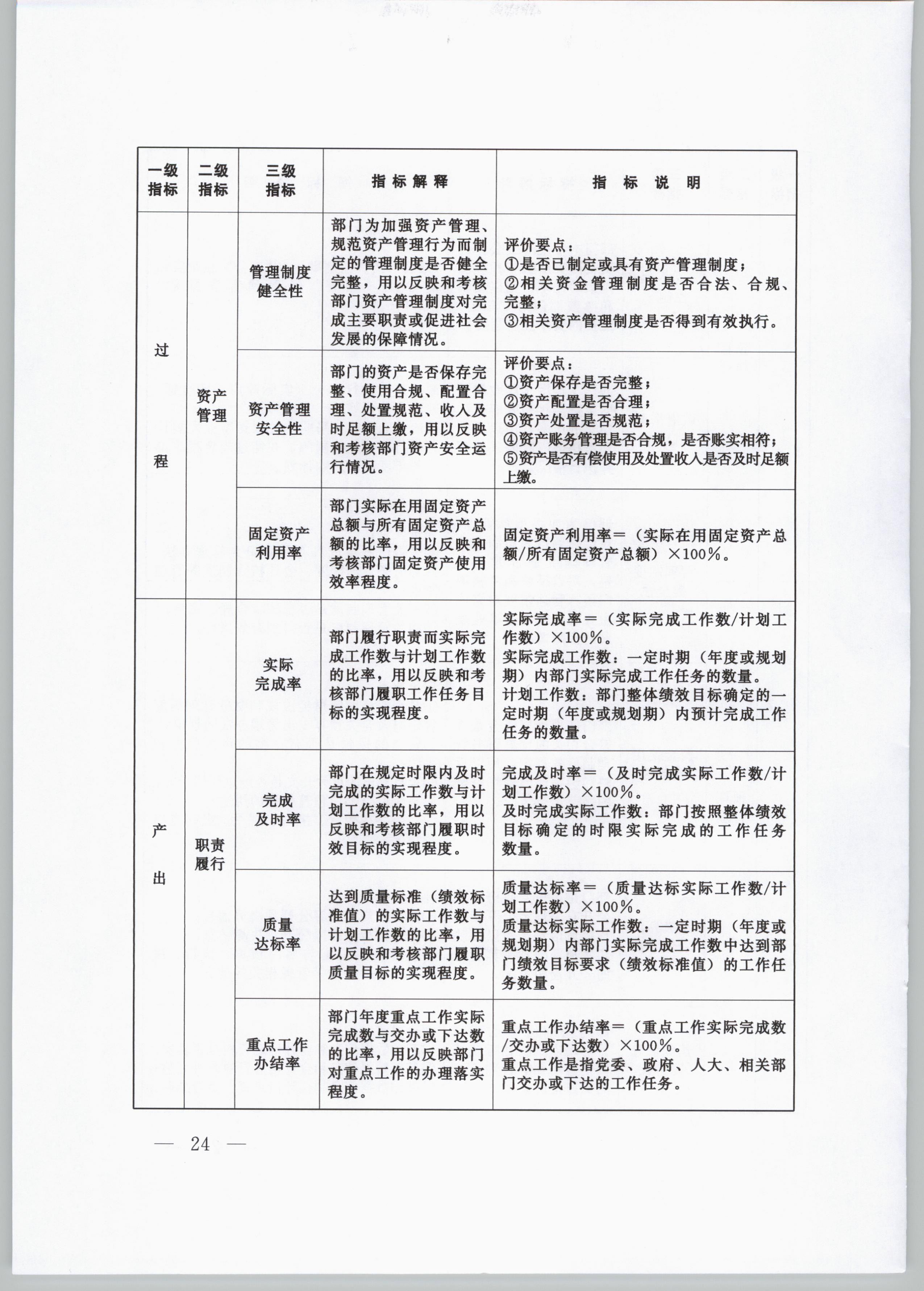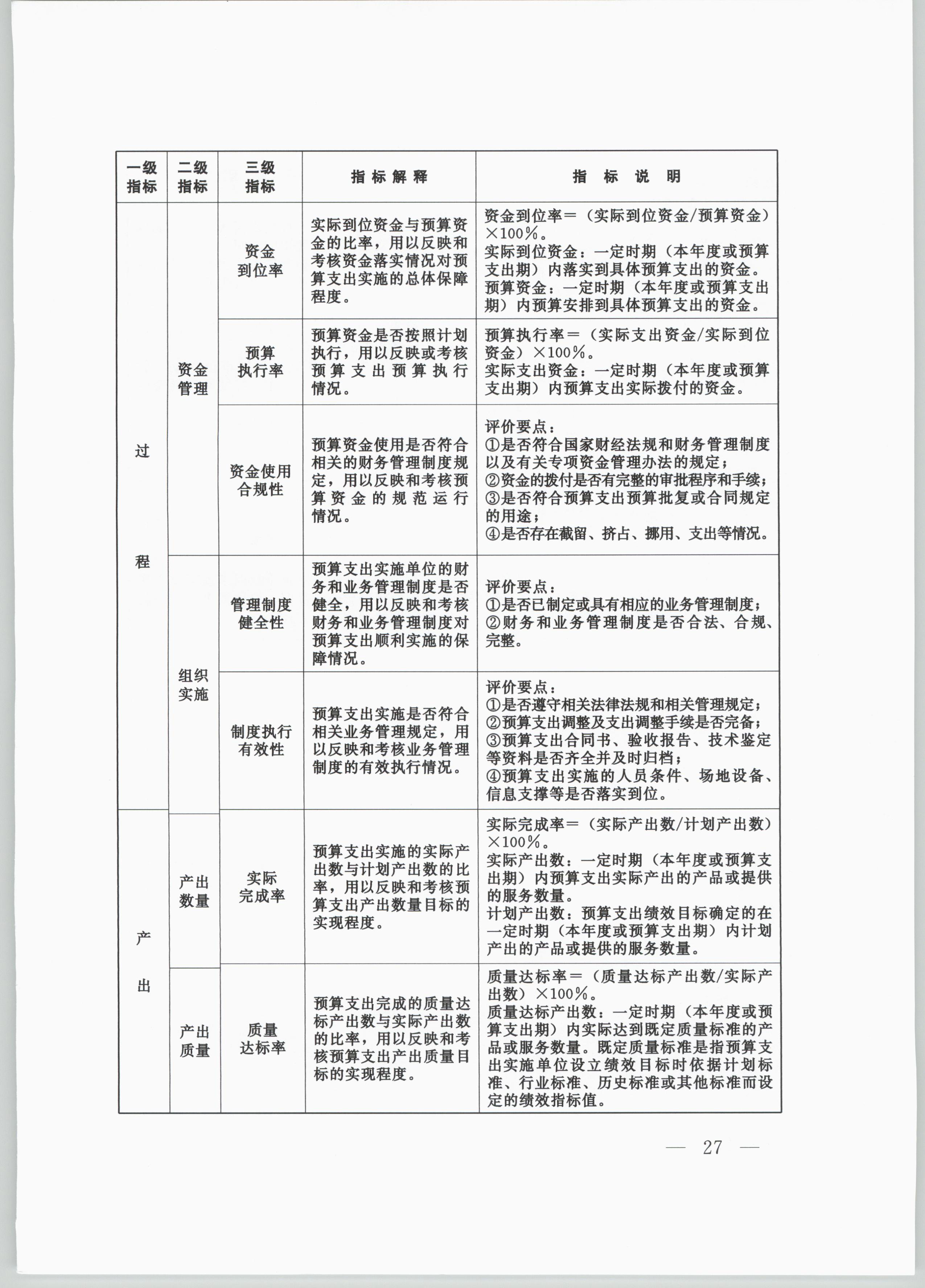 (一)產出指標。反映根據既定績效目標完成的公共產品和服務情況。產出指標可細化為:數量指標,反映根據既定績效目標完成的公共產品和服務數量;質量指標,反映提供公共產品或服務達到的標準、水平和效果;時效指標,反映提供公共產品或服務的及時程度和效率情況;成本指標,反映提供公共產品或服務所需用的成本,分為單位成本和總成本。