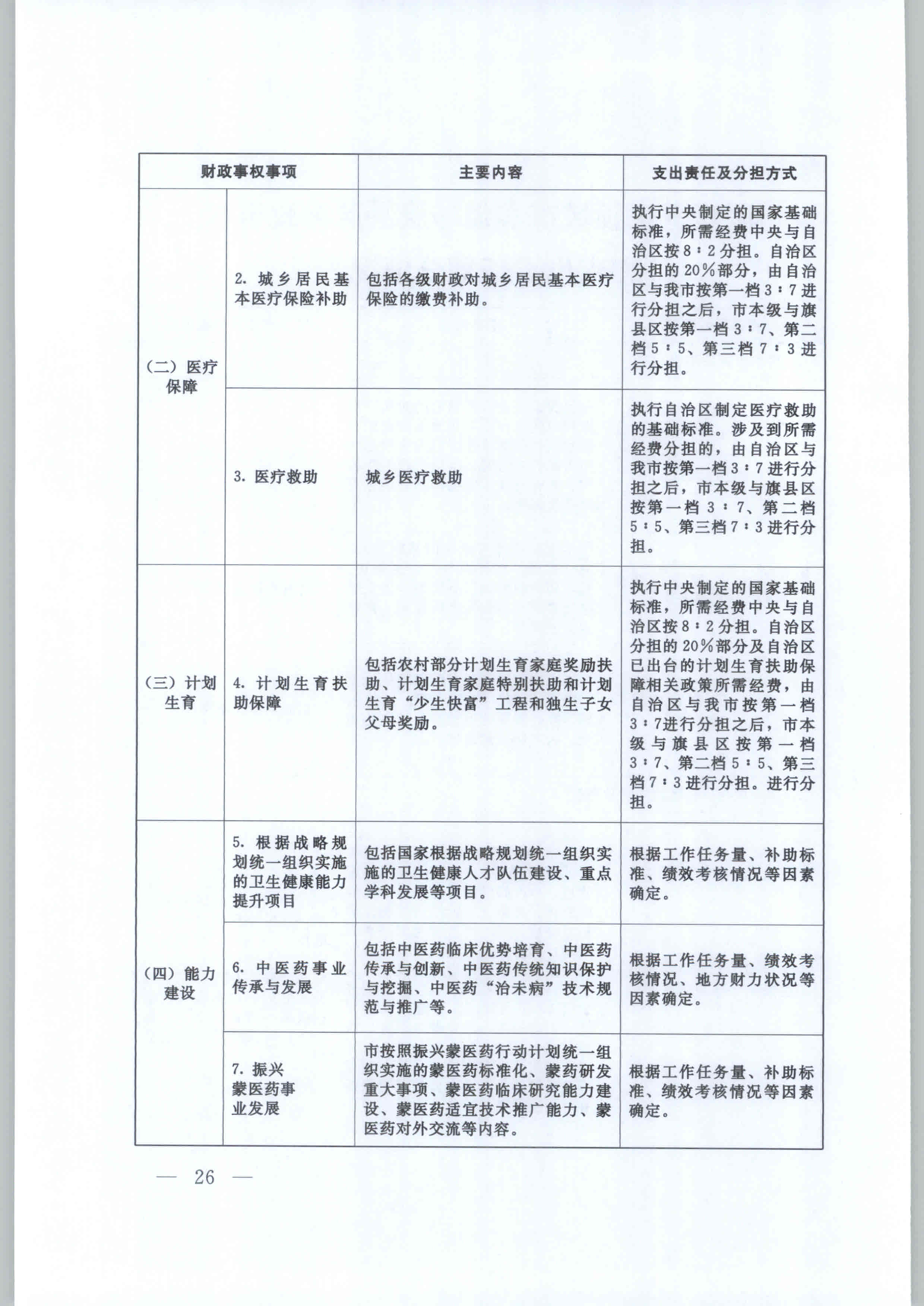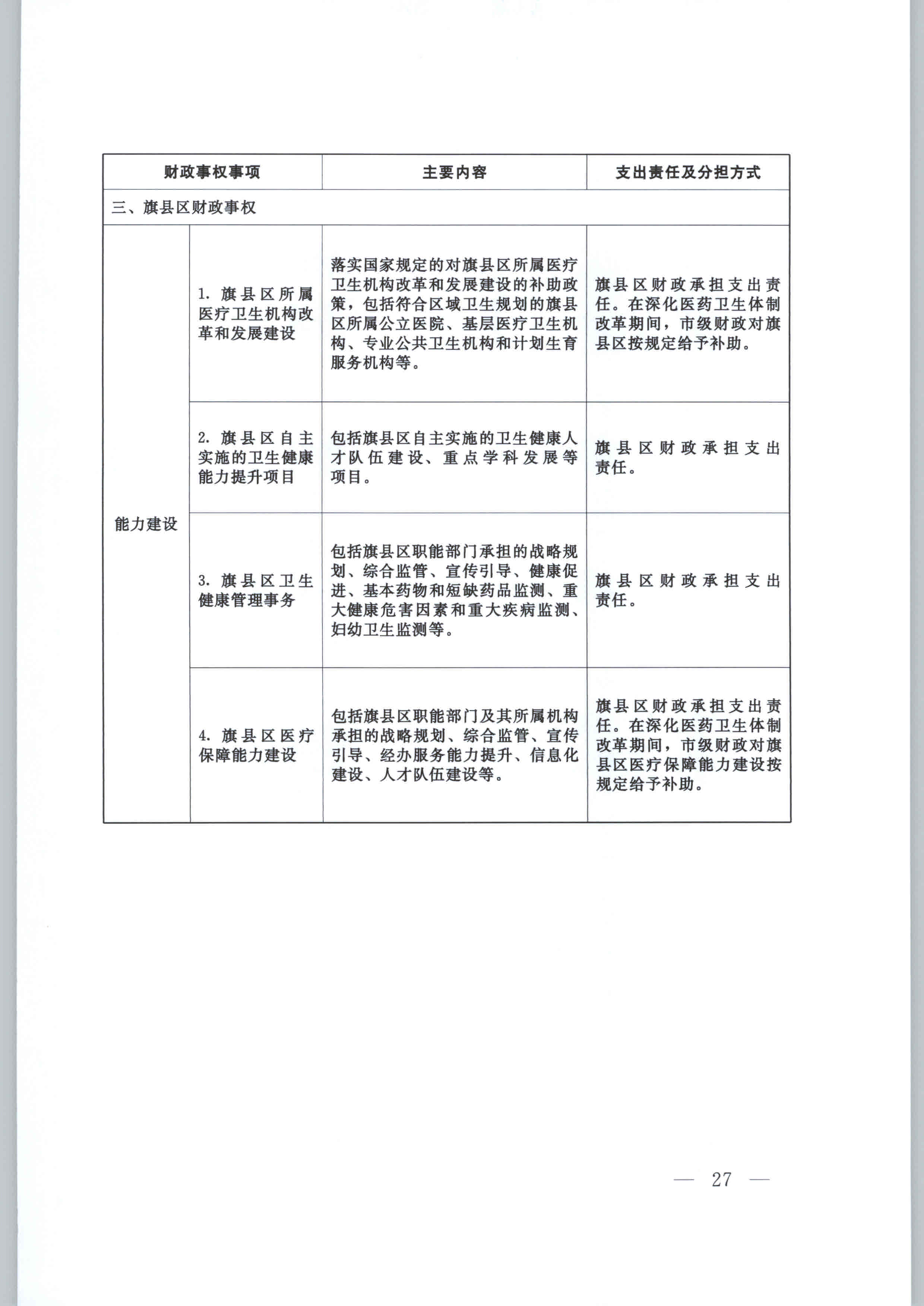 從公共衛生、醫療保障、計劃生育、能力建設四個方面,劃分市本級與旗縣區財政事權和支出責任。