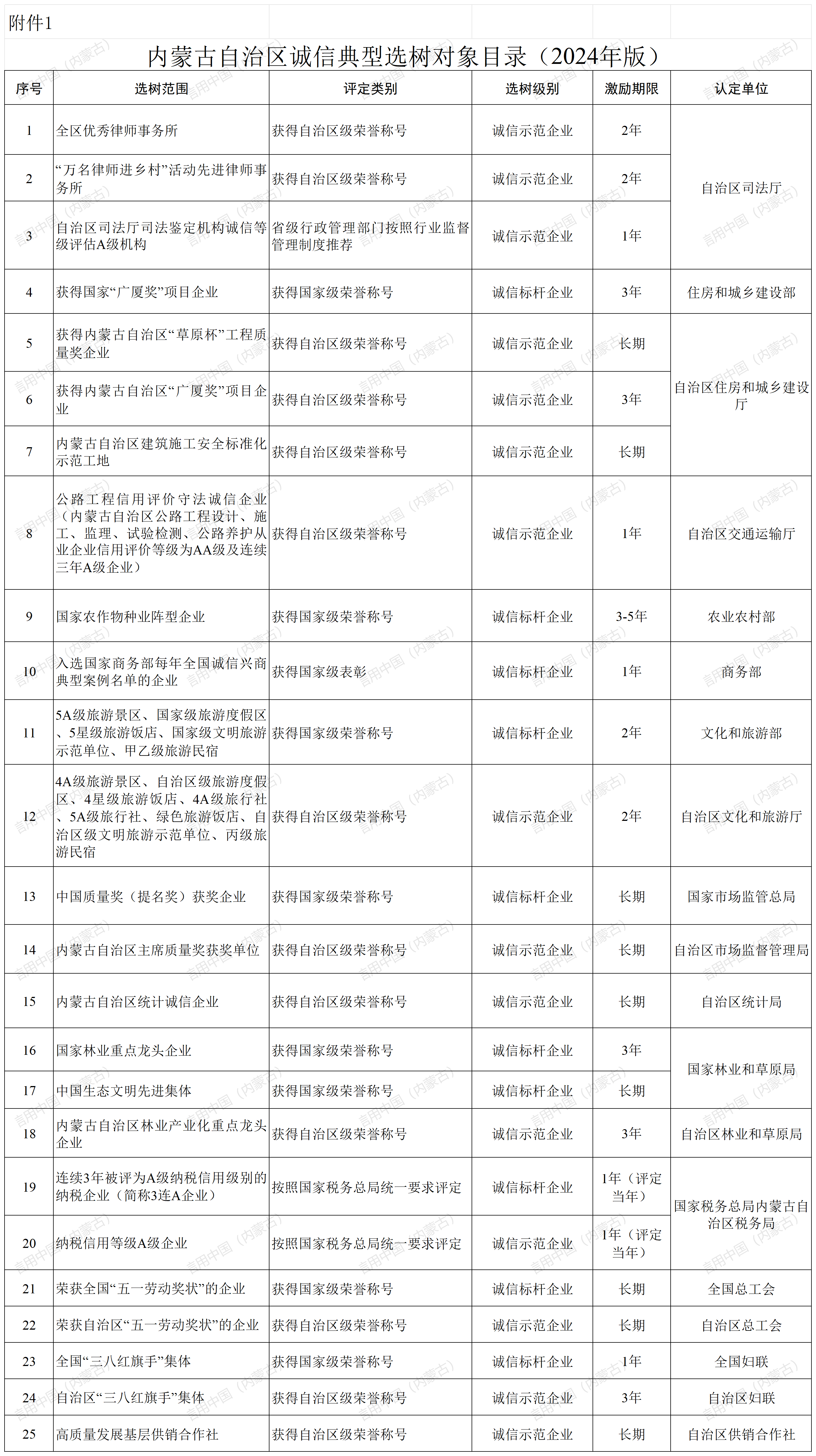 附件:1.內蒙古自治區誠信典型選樹對象目錄(2024年版)